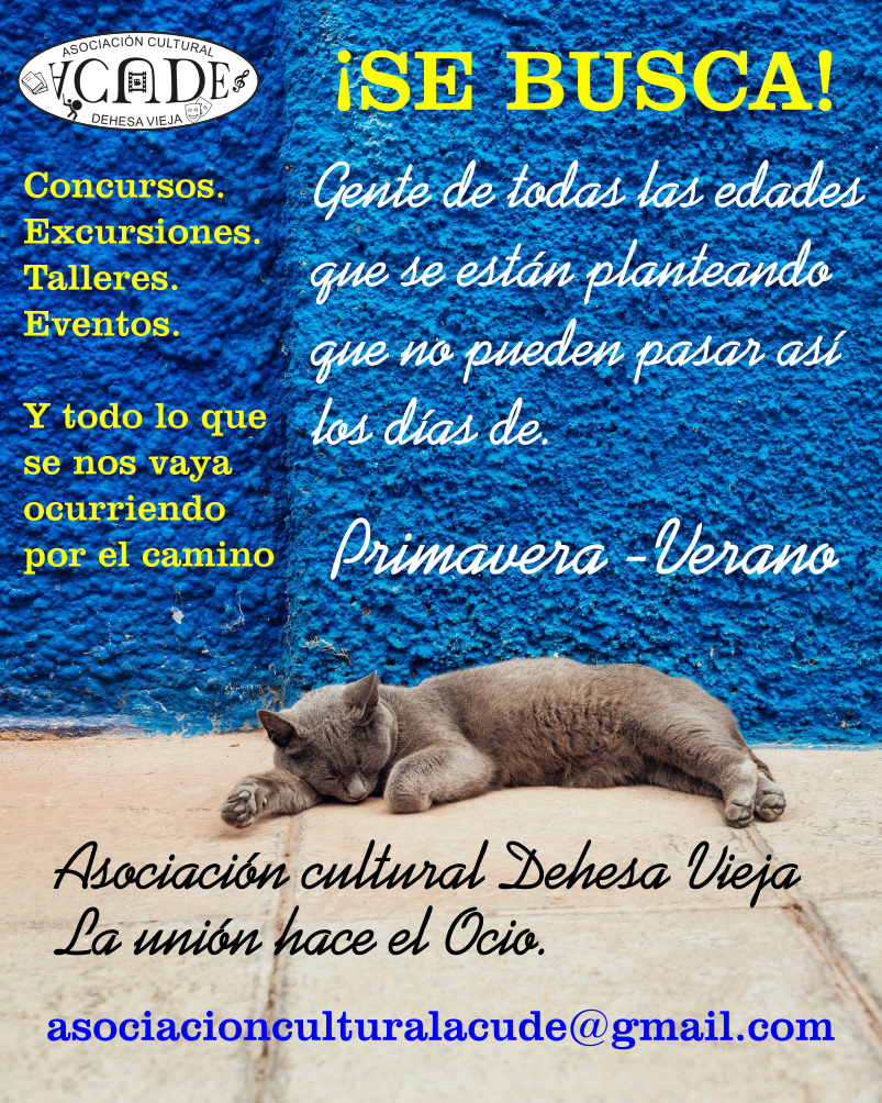 Asociación Cultural Dehesa Vieja ACUDE Nuestra Asociación fue fundada con la ilusión de dar difusión a la Cultura, Cultura de todo tipo, para todos los gustos, todas las edades y todas las personas. Fue creada en el año 2016 y no paramos de crecer y de enriquecernos con las nuevas ideas de todas las personas que la forman. Con los recursos humanos de los que disponemos, intentamos desarrollar todas esas ideas maravillosas de las personas que se interesan por nuestra asociación y contribuyen a difundir la cultura en todas sus expresiones, aunque a veces nos resulta difícil dar salida a todas ellas. Nos enorgullece ver como la familia ACUDE crece cada año un poco más y deseamos que las actividades que vayamos realizando también crezcan, os animamos a colaborar activamente para que no tengamos que aplazar ninguna de ellas y nuestra agenda cada vez sea más amplia y variada. Si quieres formar parte de nuestra asociación rellena el formulario, visitas guiadas, talleres, excursiones, jornadas solidarias y mucho más te están esperando.